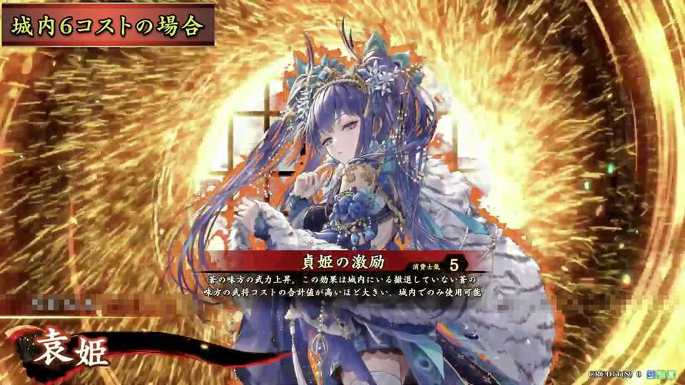 | 蒼の味方の武力が上がる。この効果は城内にいる撤退していない蒼の味方の武将コストの合計値が高いほど大きい。この計略は城内にいる時のみ使用できる | ||||