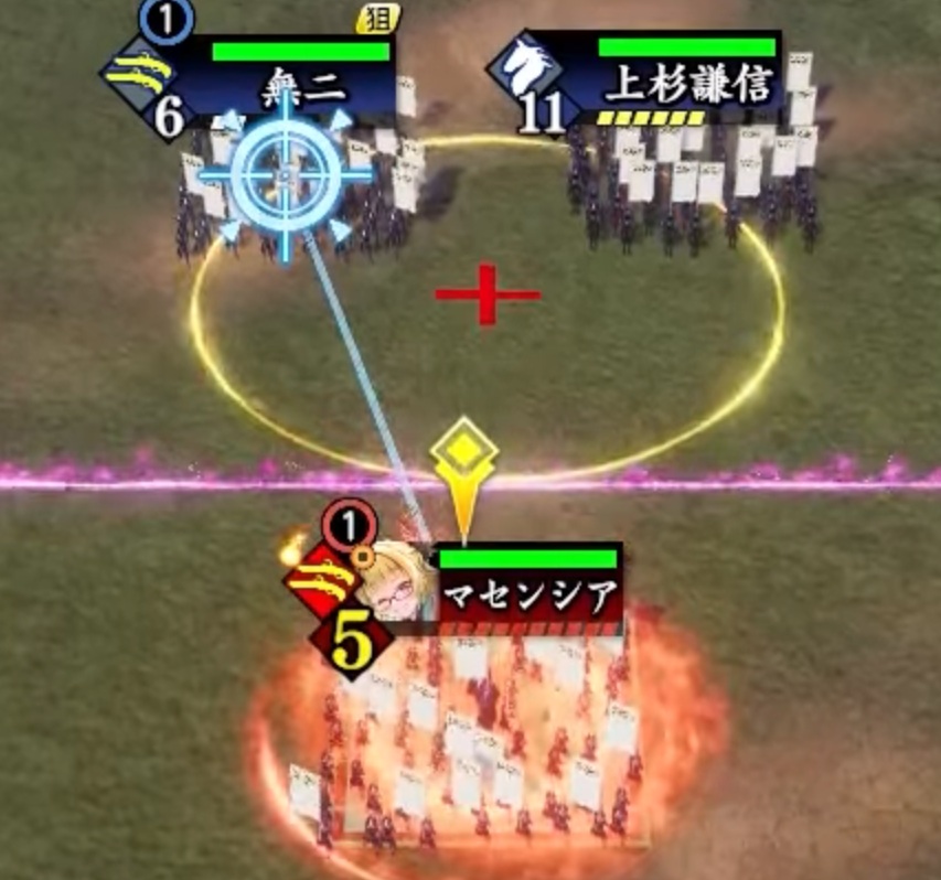 | 武力と知力が上がる。さらに以下の短計を発動できる。ただし効果終了時に一定時間計略を使用できなくなる 短計・福音【1】:向いている方向に知力によるダメージを与え、敵城門に当たると敵城にダメージを与える焙烙を発射する。ダメージは互いの知力で上下する |