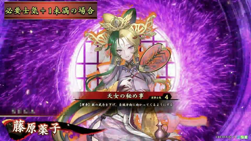 | 【渾身】(発動時の士気が必要士気に近いほど効果が大きい) 敵の武力を下げる。一定以上武力を下げると、さらに自城方向に向かってくるようにする |