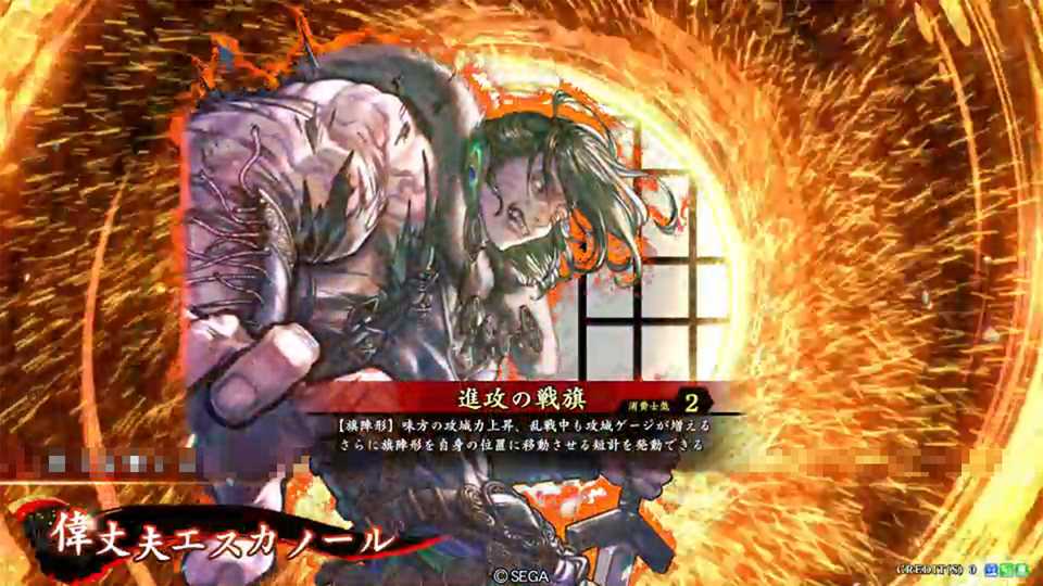 | 【旗陣形】味方の攻城力が上がり、乱戦中も攻城ゲージが増えるようになる旗陣形を設置する。さらに以下の短計を発動できる 短計・再設置【0.5】:一定時間後に自身の発動した旗陣形を自身の位置に移動させる |