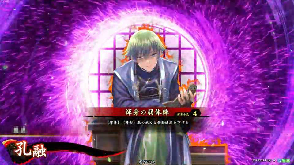 | 【渾身】(発動時の士気が必要士気に近いほど効果が大きい) 【陣形】(発動すると陣形が出現し、その中にいる間のみ効果が発生する。陣形は同時に複数発動できない) 敵の武力を下げる。一定以上武力を下げると、さらに移動速度を下げる |