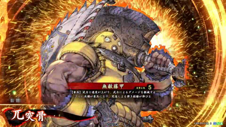 武力と移動速度が上がり、武力によるダメージを軽減する。さらに兵種が象兵になり、突進による弾き距離が伸びる |