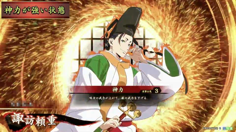 | 【ため計略】(使用すると移動と兵種アクションができなくなり、一定時間後に計略が発動する。この計略は反計されない) カードの位置に神力を設置する。神力の効果は徐々に上がるが、一定時間後に徐々に下がる。神力設置中に自軍の士気を消費することで再度計略を発動できる。再度計略を発動した場合、味方の武力が上がり、敵の武力を下げる |