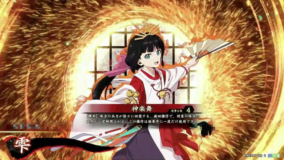 味方の兵力が徐々に回復する。さらに旋回操作を行うと、対象の味方の武力が一定時間上がる。この操作は効果中に一度だけ使用できる